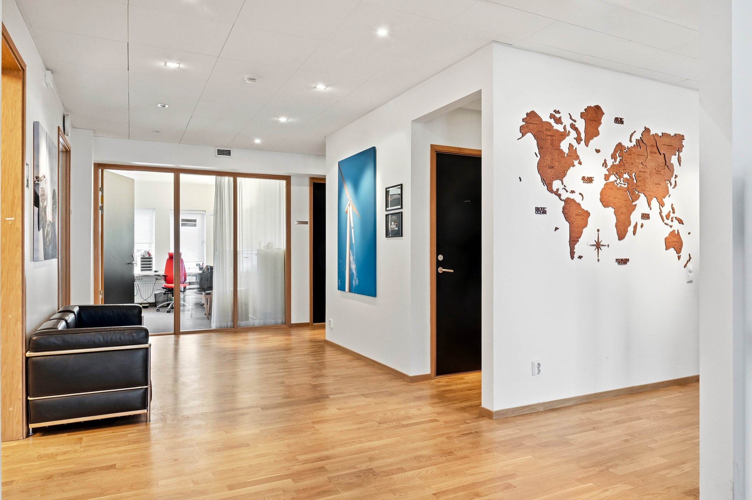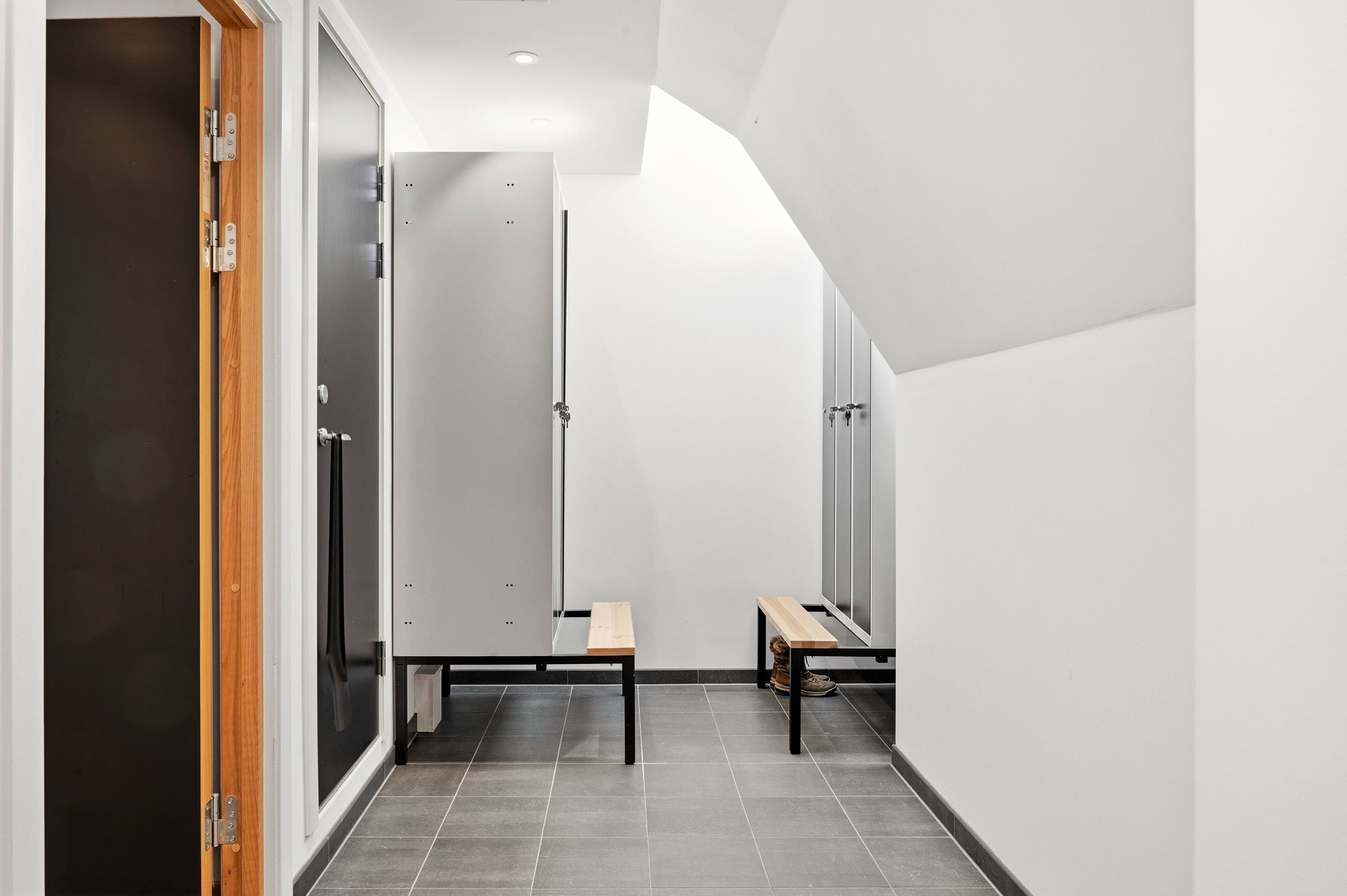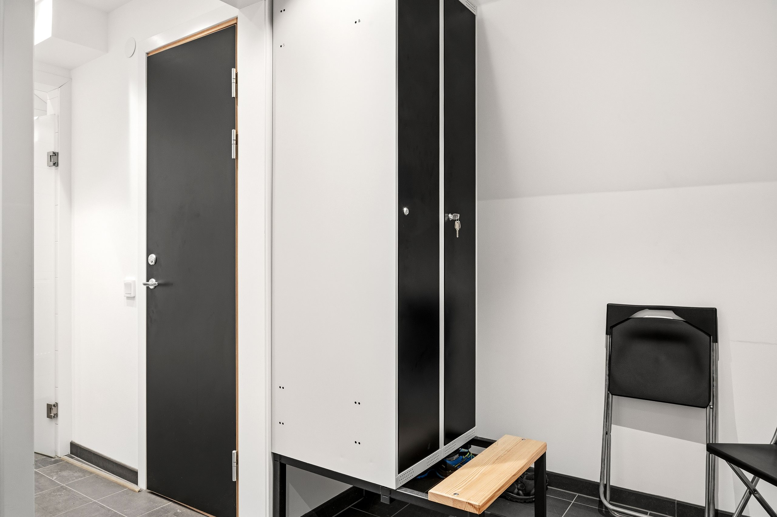 På de övre planen finns ytterligare utrymmen för kontor, konferens samt produktion eller lager. Ljusa materialval och välplanerade ytor bidrar till en trivsam arbetsmiljö. Här finns även omklädningsrum med dusch och wc samt tillgång till bastu, vilket ger goda personalutrymmen.