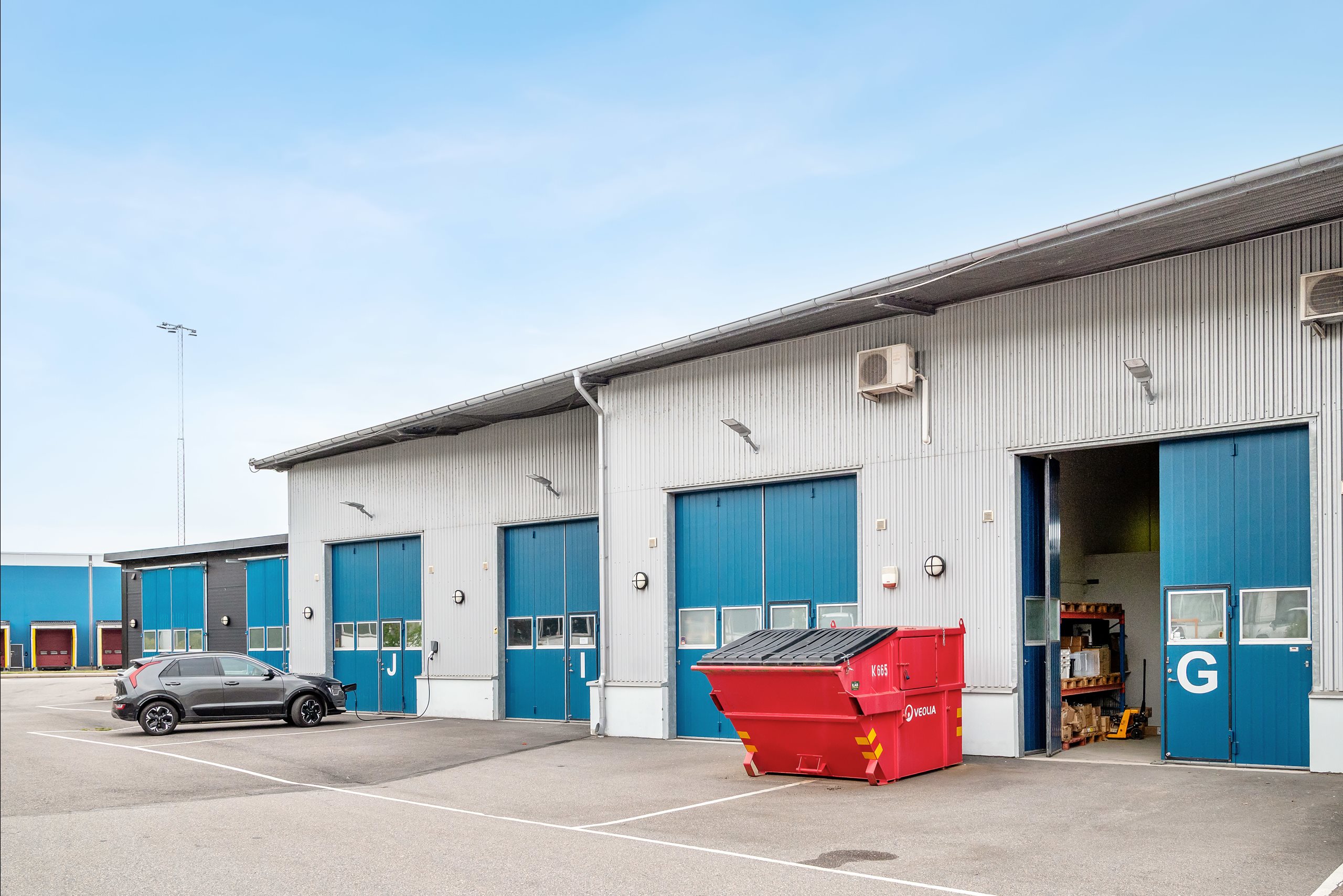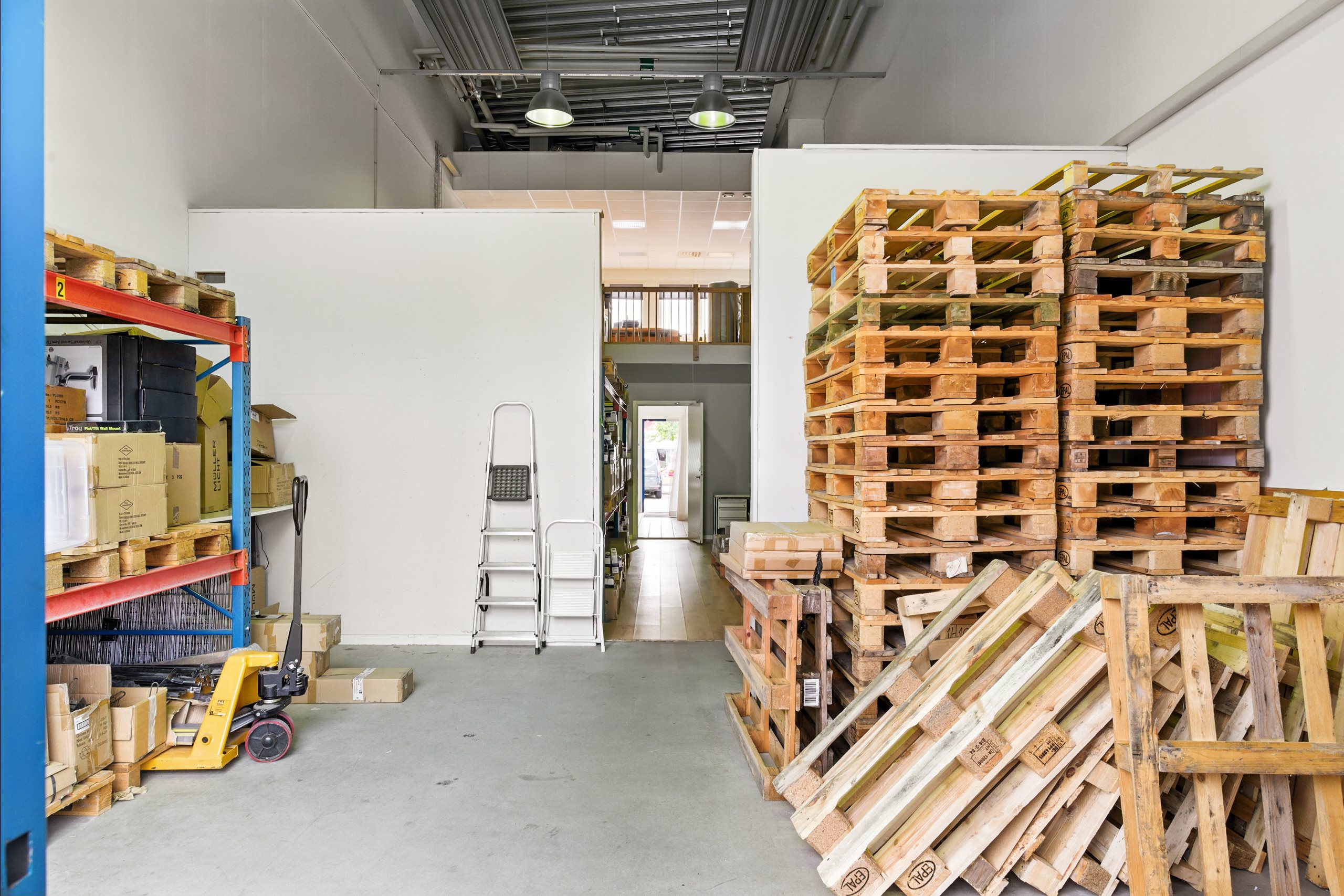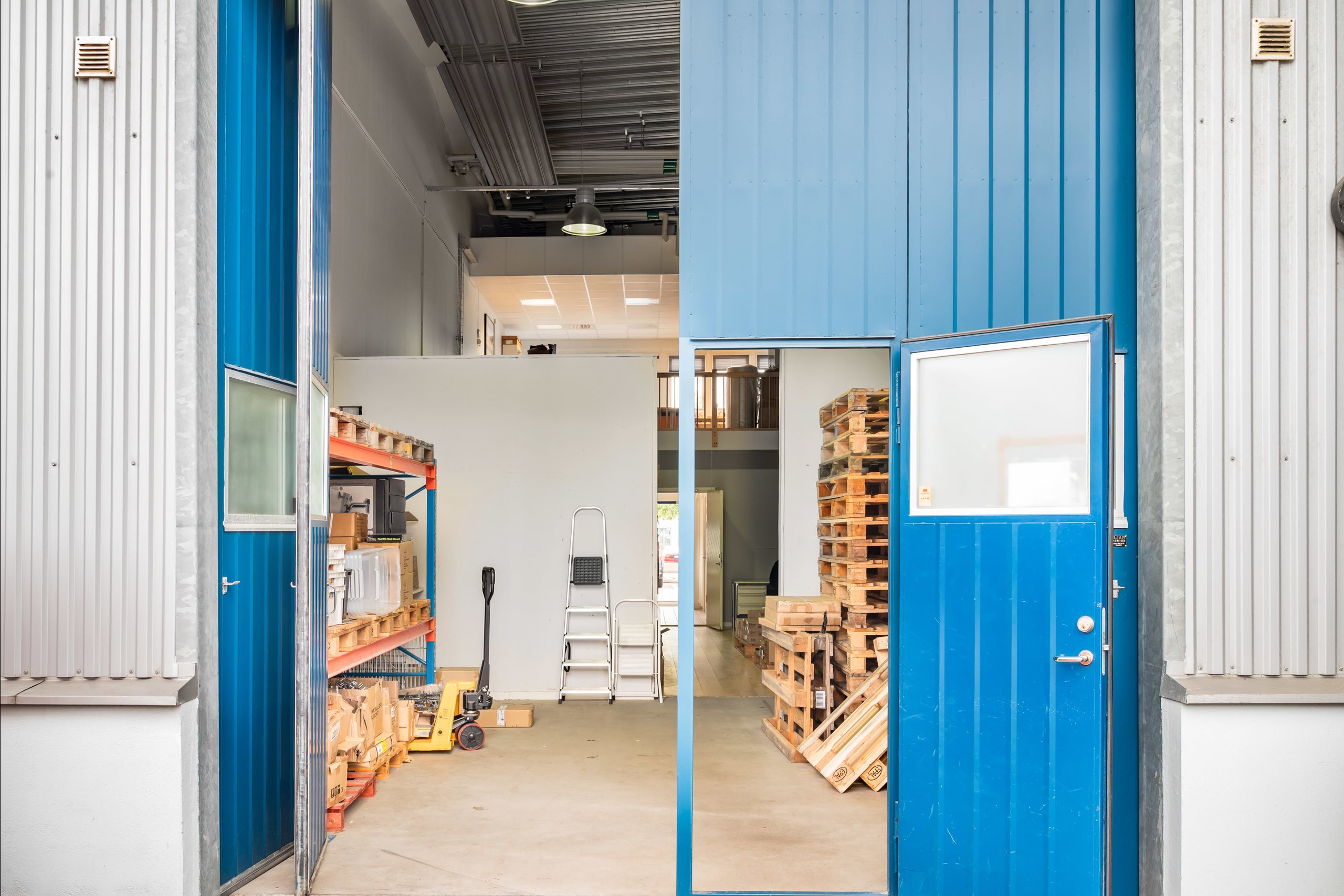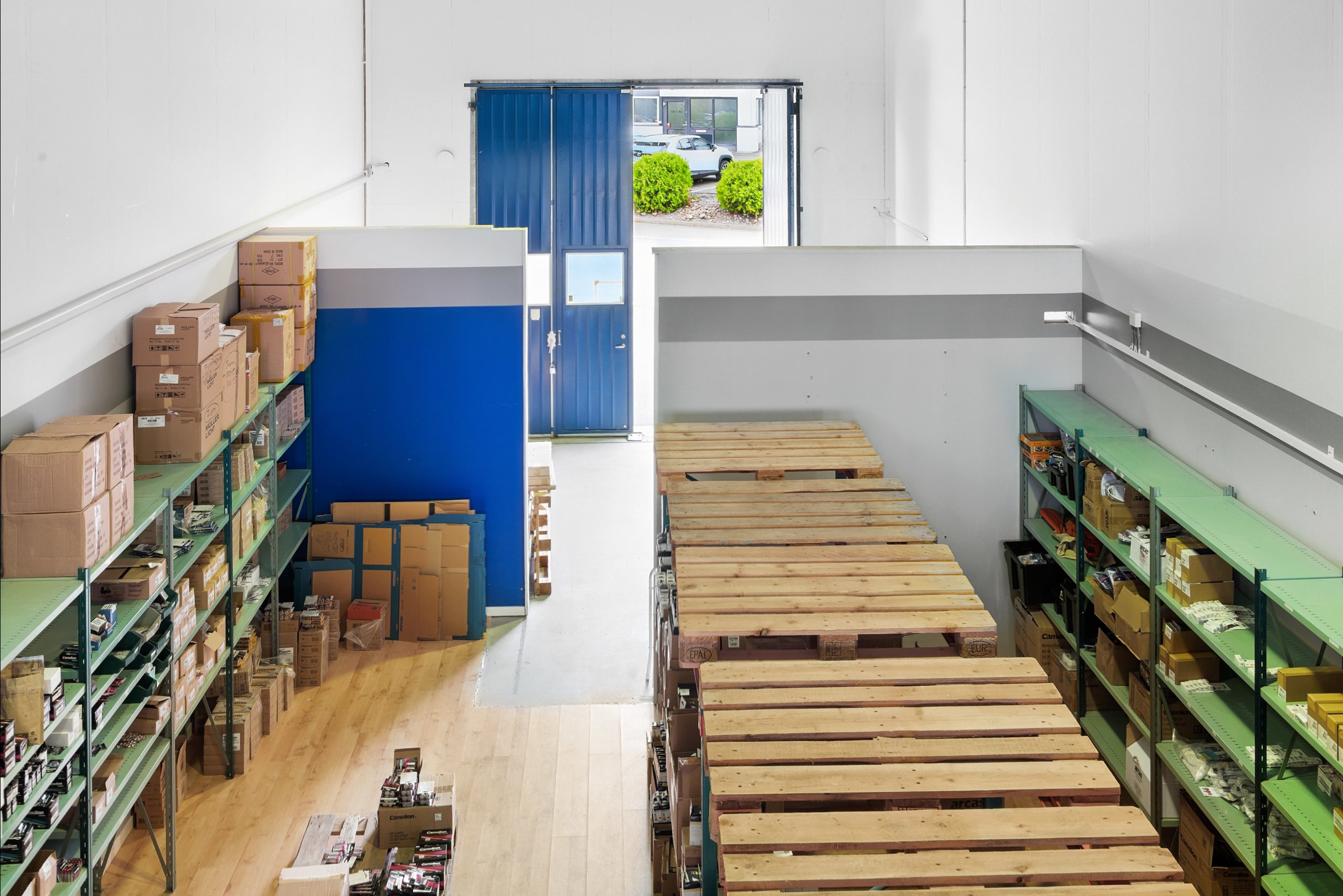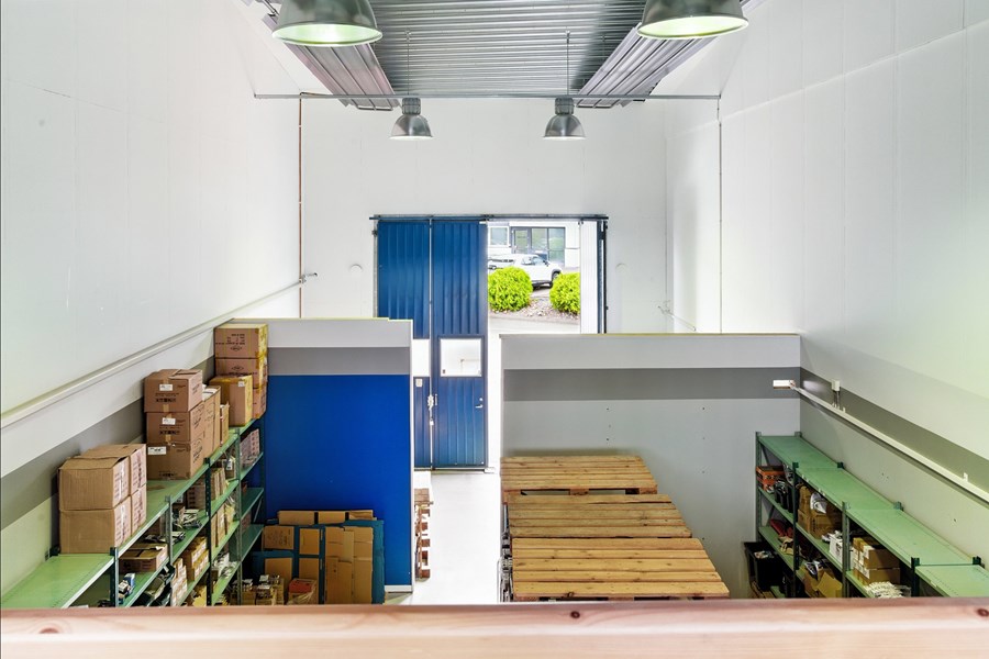 Lagret nås via en stor vikport, och på baksidan finns en mindre yta för parkering. Från lagret leder en trappa upp till entresolplanet, där det finns utrymme för kontorsplatser och en god överblick över lagerytan.