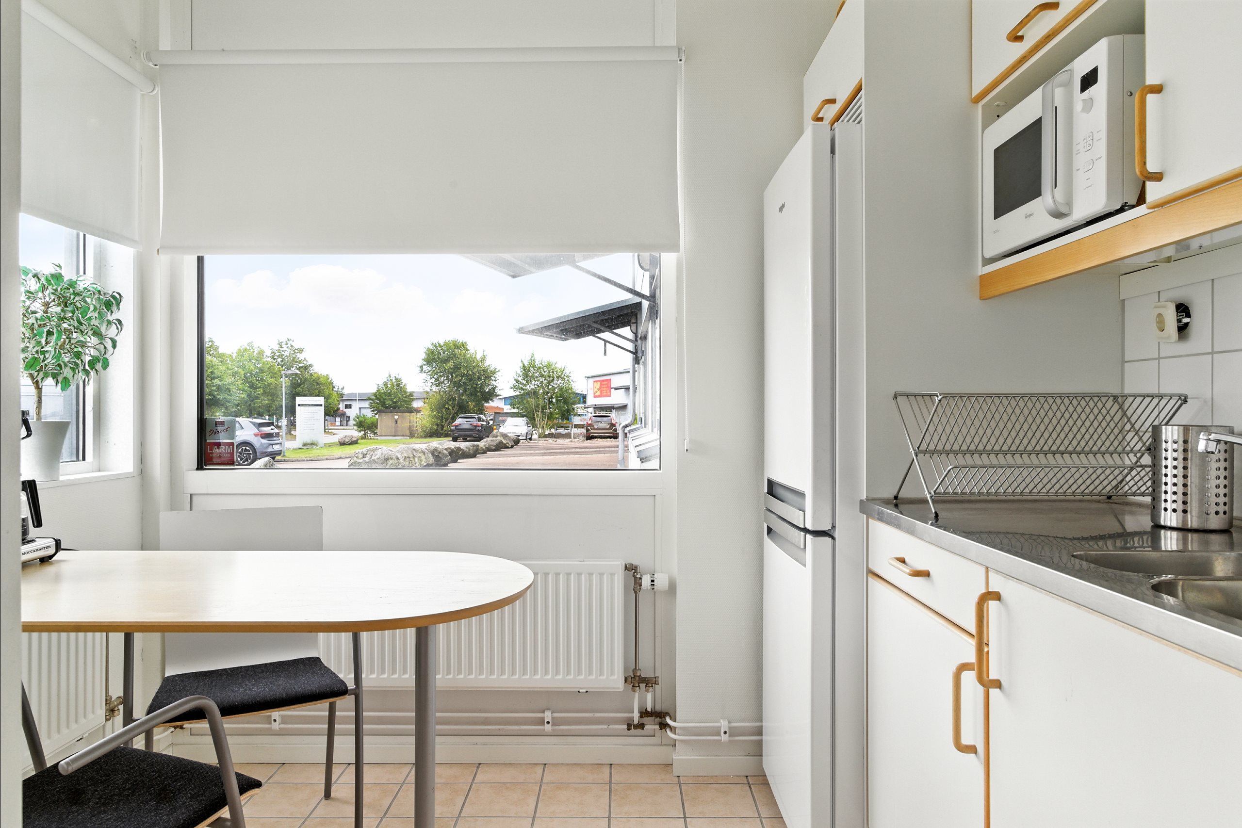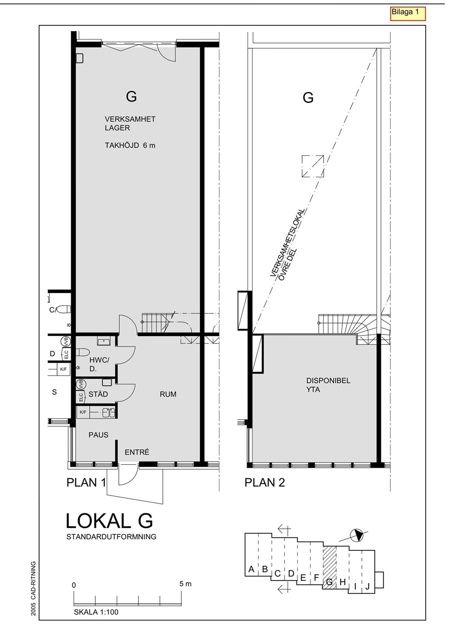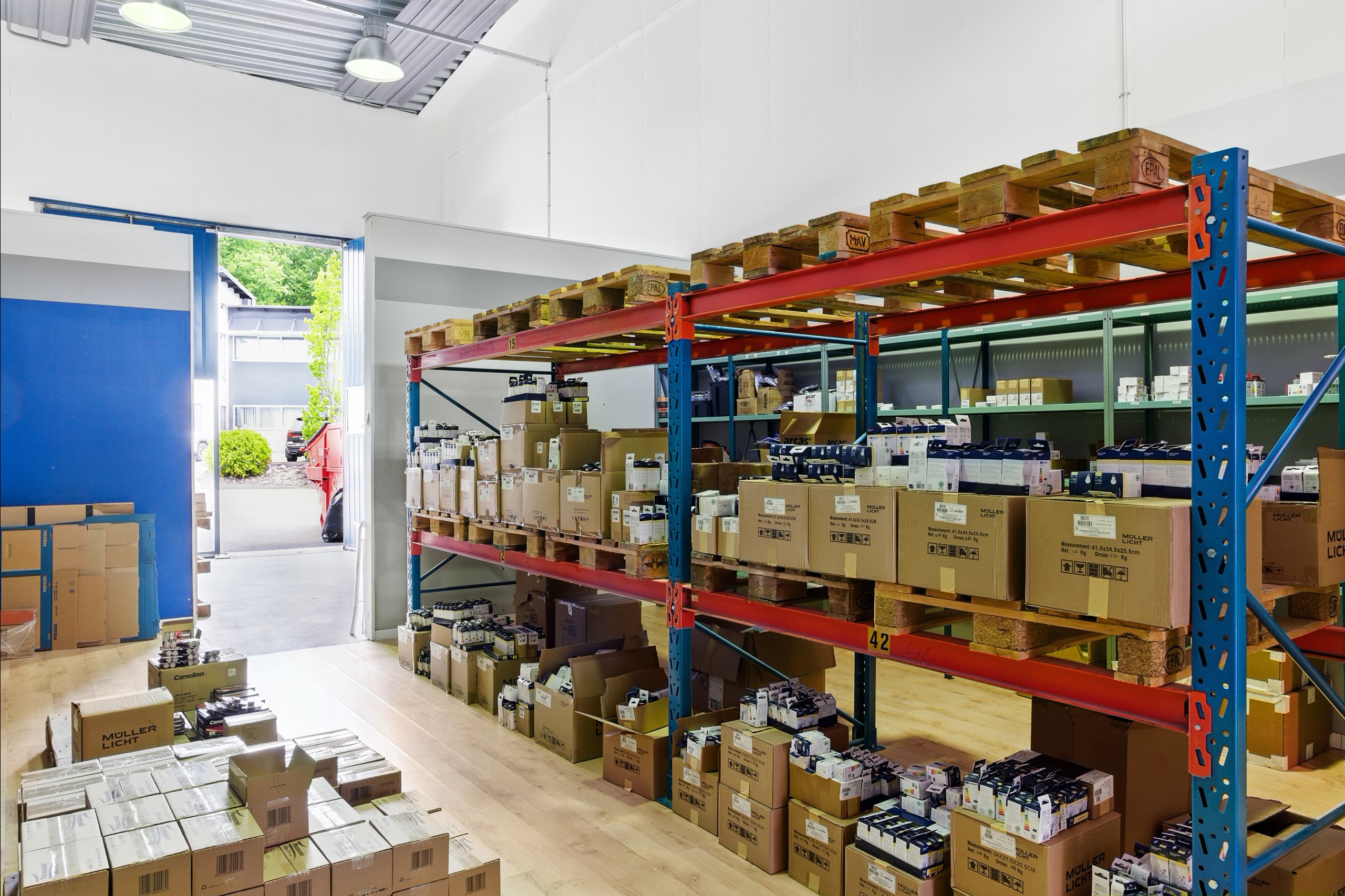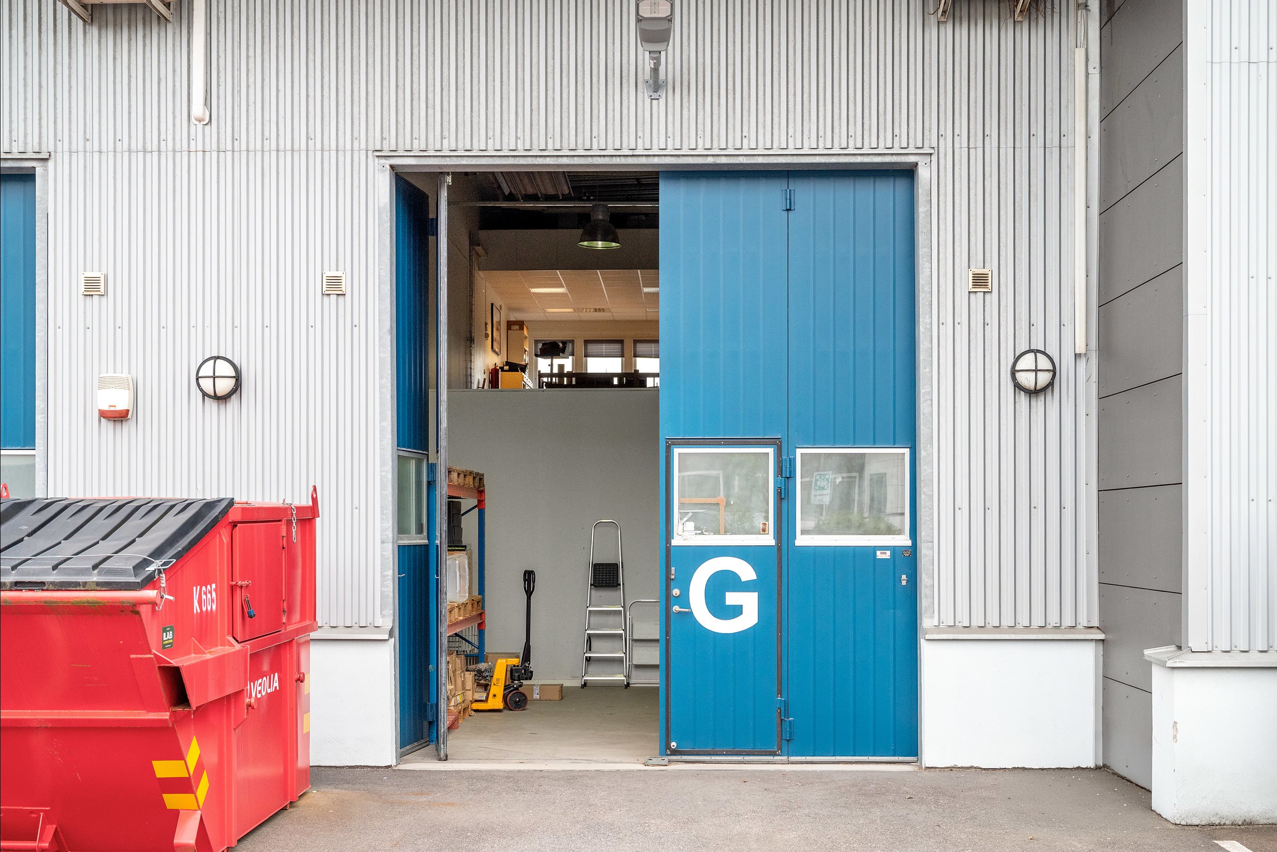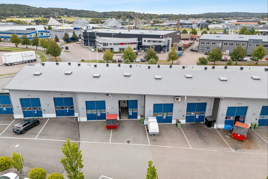 Lagret nås via en stor vikport, och på baksidan finns en mindre yta för parkering. Från lagret leder en trappa upp till entresolplanet, där det finns utrymme för kontorsplatser och en god överblick över lagerytan.