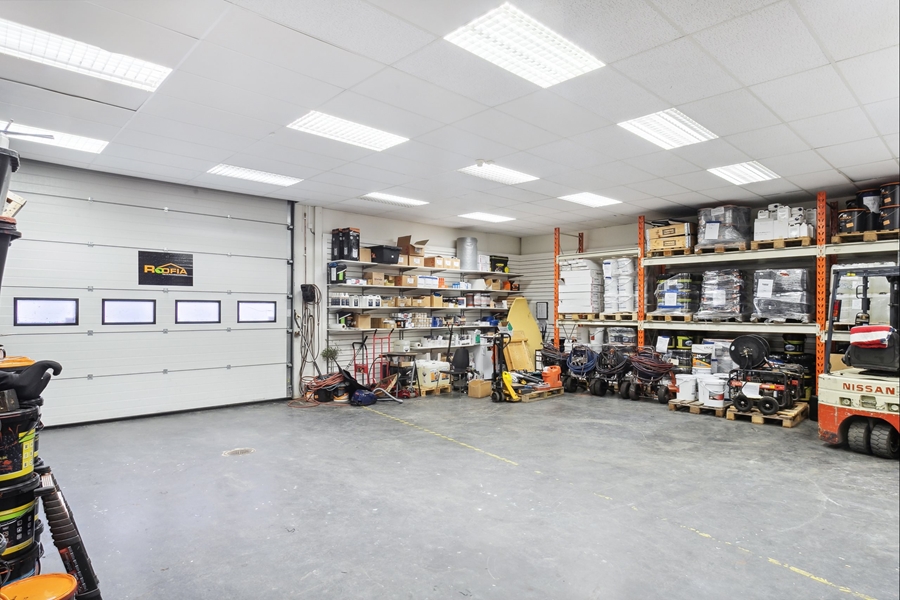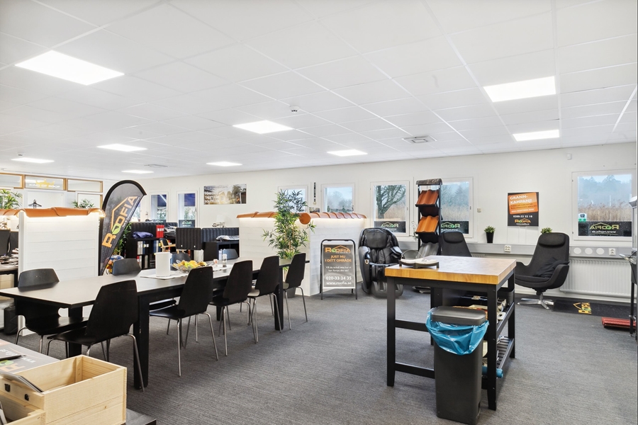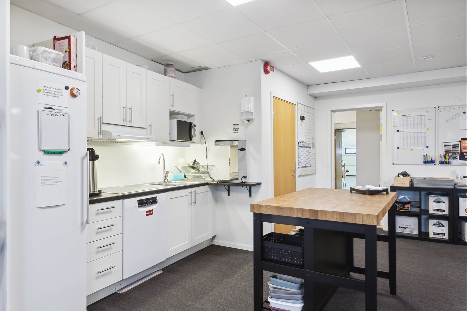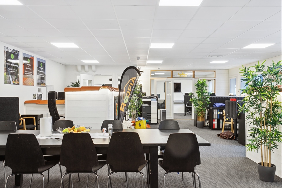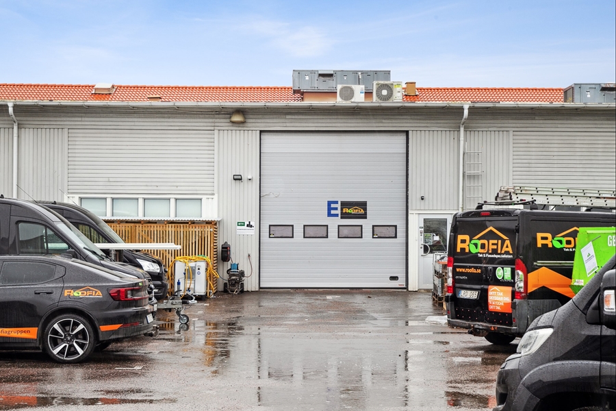 Entrén till lokalen är mot E6:an och där har du även parkeringsplatser, det finns även möjlighet att hyra laddstolpar. Väl inne i lokalen har du en öppen planlösning med köket direkt till vänster om entrén samt plats för ett större matbord. Det finns kontorsplatser i ett öppet landskap, ett kontor med två kontorsplatser samt konferensrum. Vidare från kontoret har du ett stort omklädningsrum med plats för ca 20 skåp och ett förråd samt toalett med dusch. Lager delen med port ut mot gården samt ingång till ett utrymme som idag används som tvättstuga.