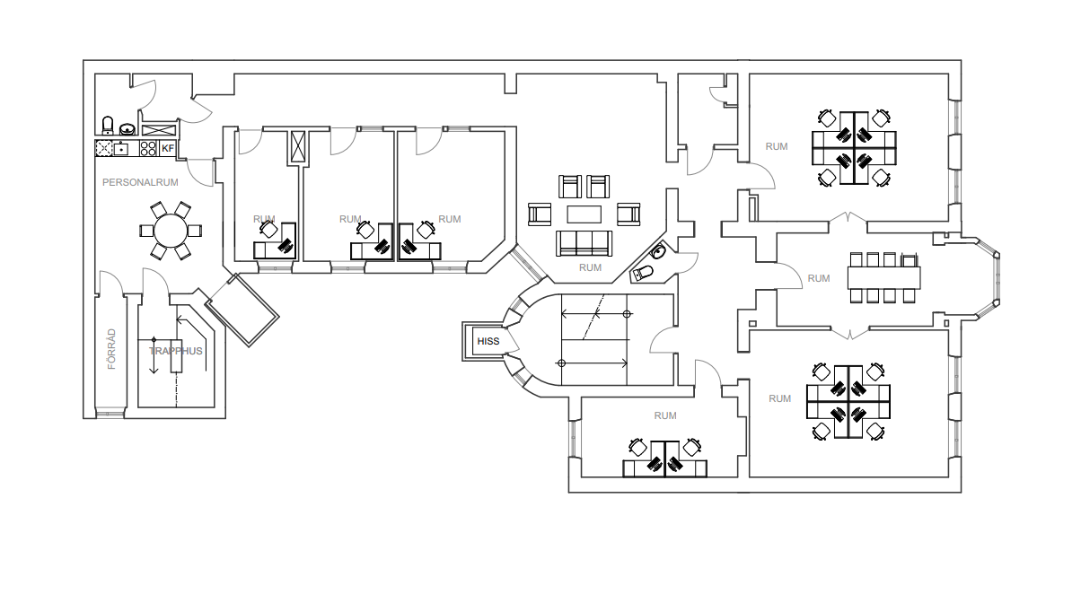 Här finns flertalet rum som kan användas som såväl kontorsrum som mötesrum. Våningen är klassiskt uppdelad i en mer extern och en mer intern del.
