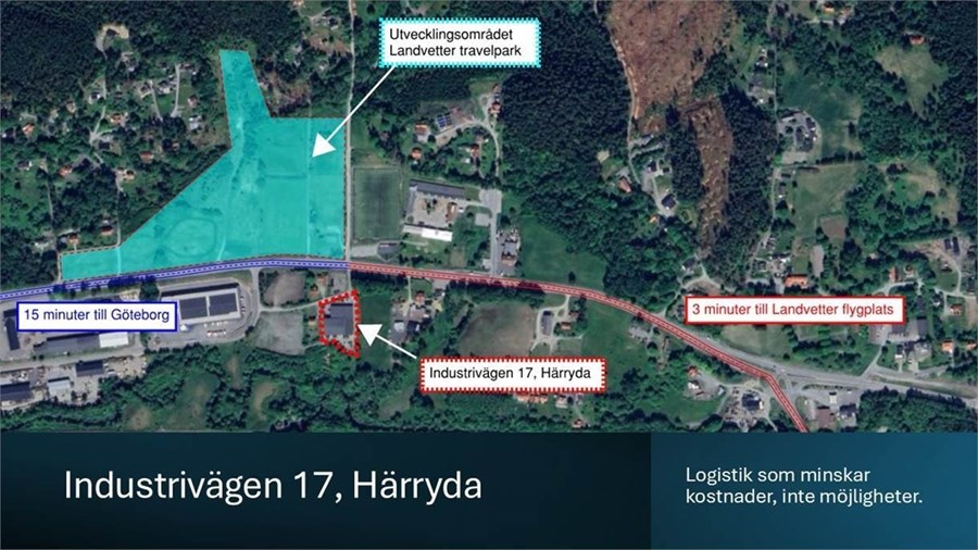 Nu finns en unik möjlighet att etablera eller utveckla din verksamhet på Industrivägen 17 i Härryda – ett område i stark utvecklingsfas med optimalt logistiskt läge i direkt närhet till Landvetter flygplats, den nya stadsdelen Wendelstrand samt Landvetter Travel Park med hotell, handel och verksamheter.