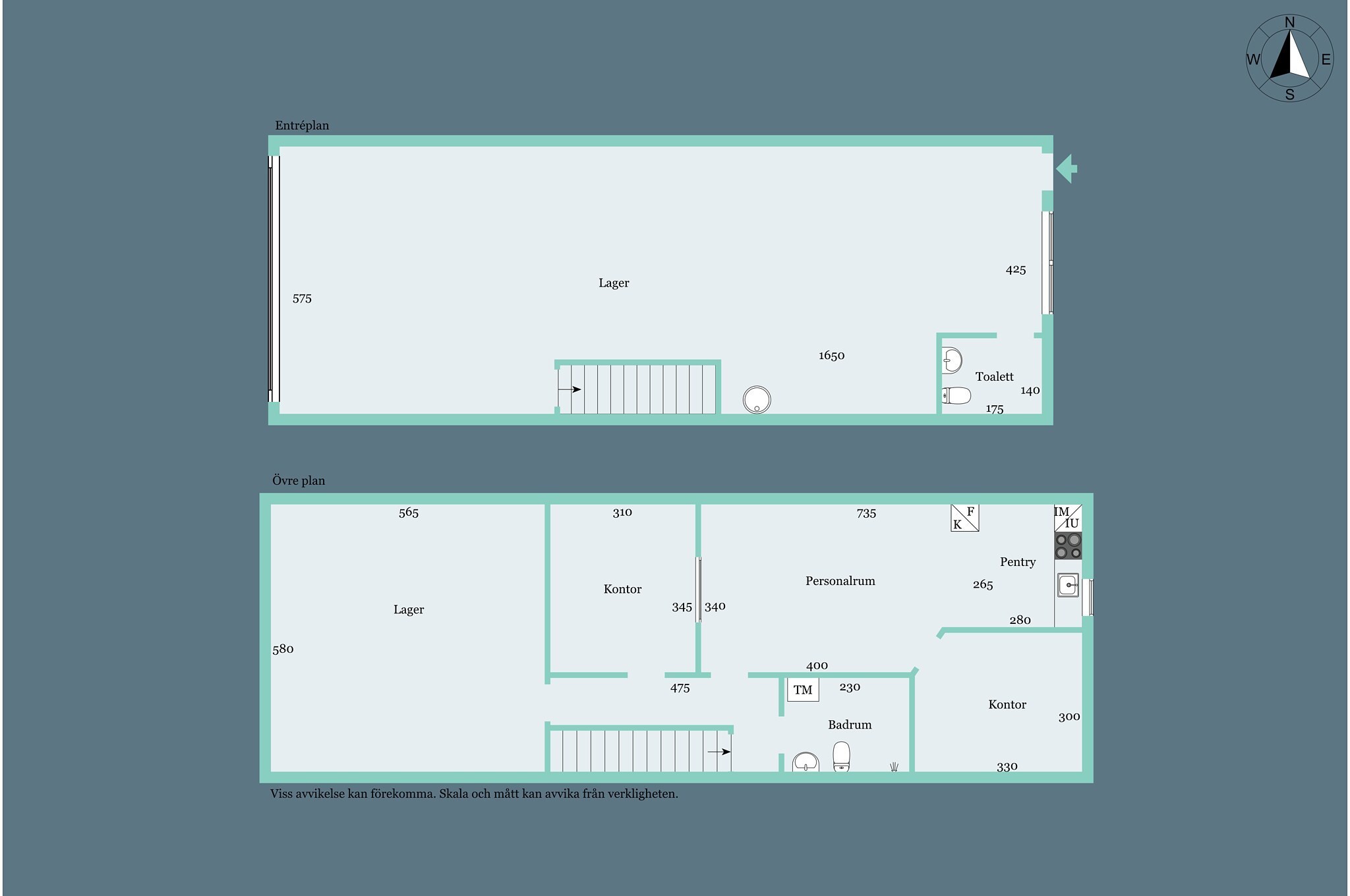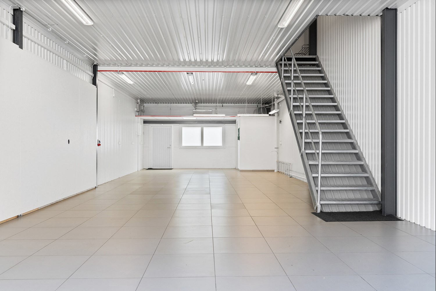 Övre planet är inrett med två fina kontor, ett rejält personalutrymme med pentry samt lageryta. Denna lageryta kan nås såväl från övre planet som från vikporten från gården. Övre planet är även utrustat med helkaklat badrum som innehåller såväl dusch som tvättmaskin.