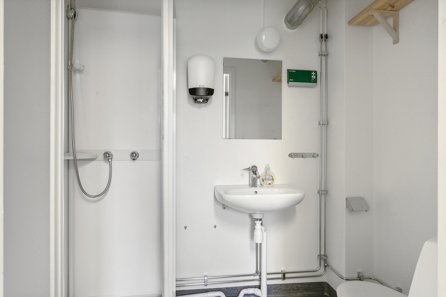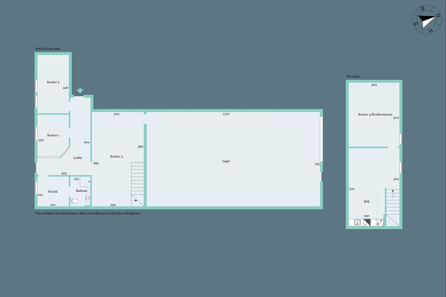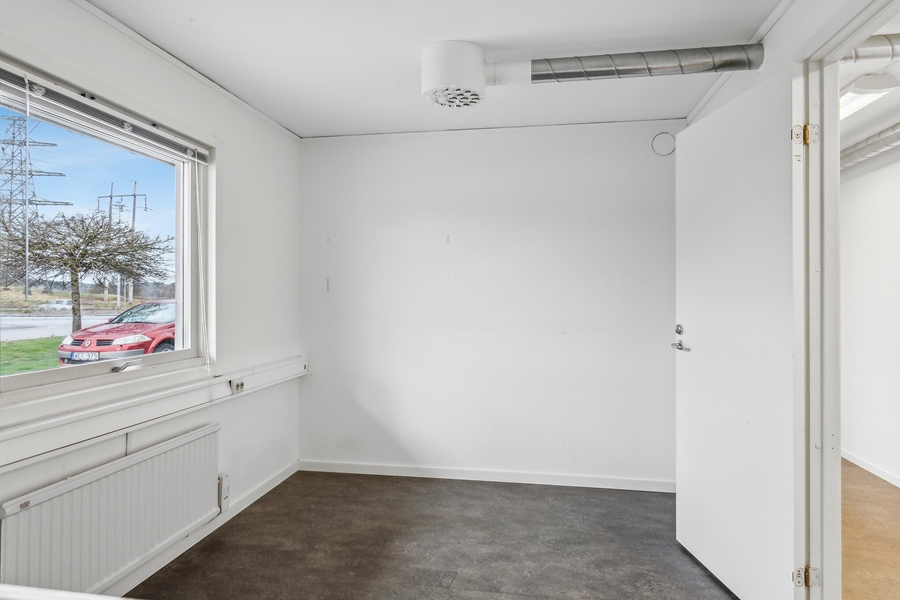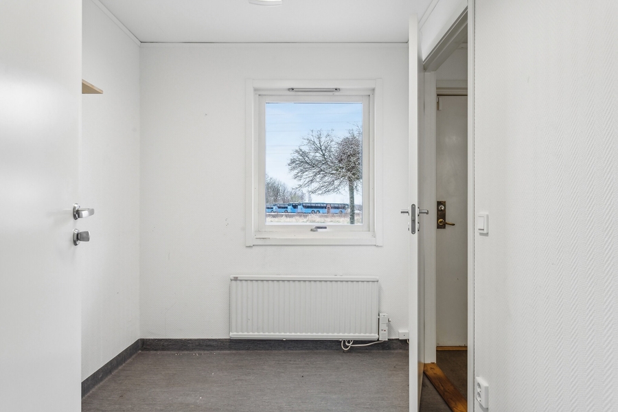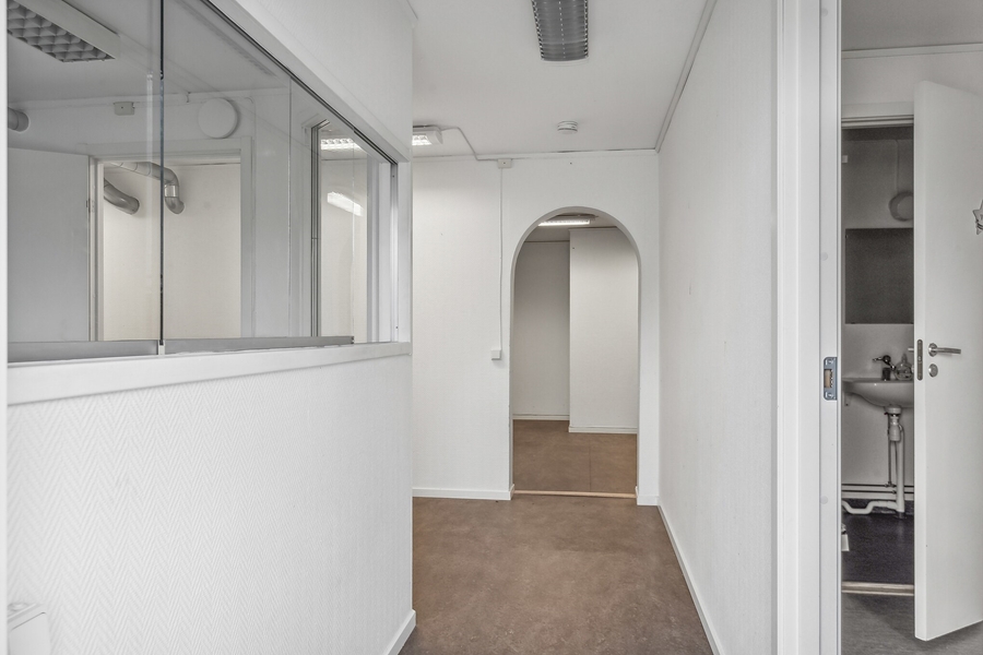 Kontoret nås via byggnadens framsida där man möts av en större lobby, med förråd och badrum utrustat med Dusch och WC. Längs med husets framsida finns två större kontorsrum för 2-4 personer. Vidare mot lagret finns ytterligare ett större kontorsrum samt ingång till lager och trappa upp till entresolen.
