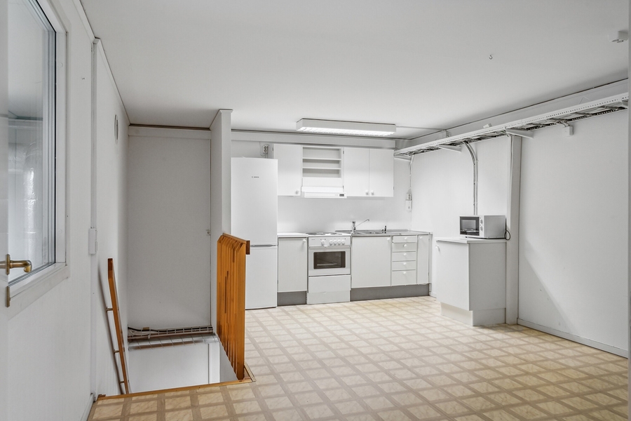 På entresolen finns en större yta med kök som passar fint som lunchrum. Här finns även ett större konferensrum.