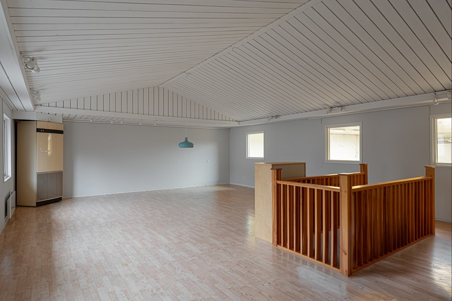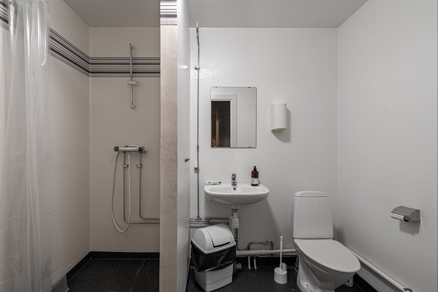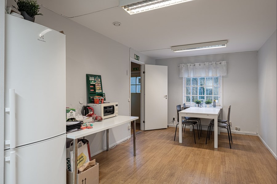 I lokalens bakre del finns personalytor och kontor. På entréplanet finns kök, två st förråd, kontorsrum samt 2 toaletter och dusch. På övre planet finns en öppen och fin kontorsyta / mötesrum med överblick över lagret.